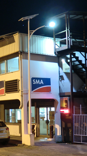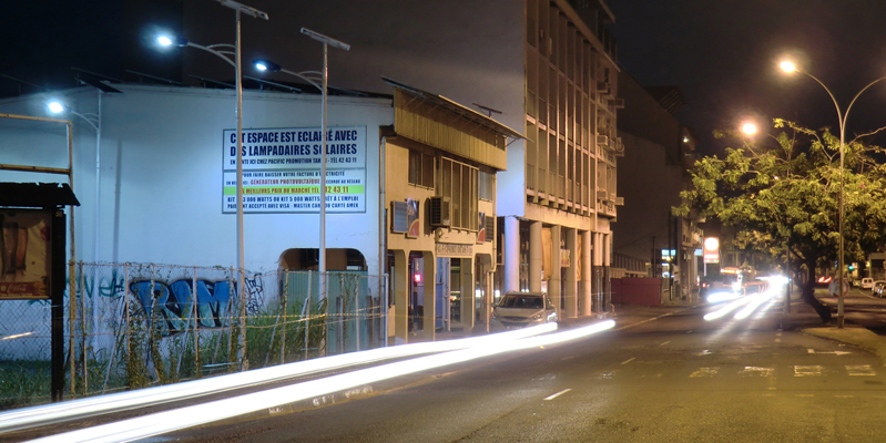 De nuit les bureaux de la société Pacific Promotion Tahiti à Papeete sont protégés par l'éclairage du lampadaire solaire. |