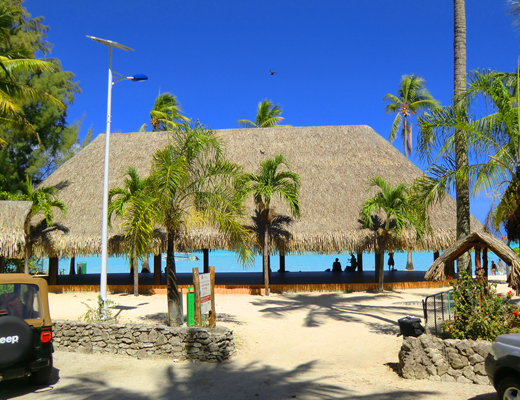 De jour le lampadaire solaire se fond dans le paysage du fare pote de Bora Bora de la pointe Matira. |