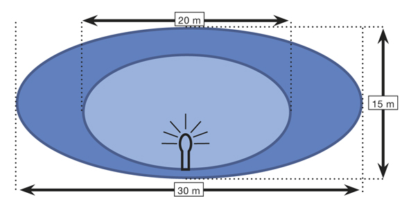 La lanterne est équipée de 2 jeux de 15 lampes LED de 1 watt. LED signifie une lampe à diode électroluminescente. Cette technologie est parfaitement maîtrisée. Outre le fait que la durée de vie de la LED est donnée pour 30 000 heures, soit environ 7 ans, le rapport entre sa consommation et son éclairage est 130 W pour une lampe à incandescence. Son éclairage atteint une température de couleur de 5 700 à 6 500 Kelvin. |
